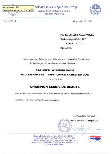 Oct. 25, 2024 - certificate Junior Champion Serbia